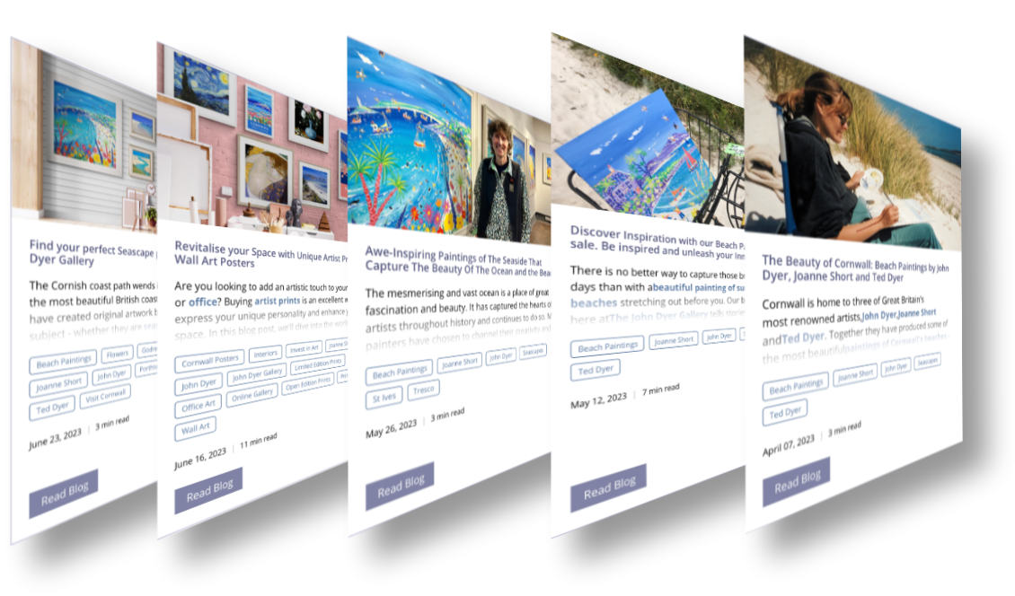 Each week our acclaimed weekly magazine art blog brings you a new article exploring art, art history, Cornish art and the places that inspire our artists. From Cornish cliff walks to painting expeditions in France, Italy and around the world. The John Dyer Gallery magazine art blog will provide you with inspiration and ideas all year round. Our blogs contain links to contemporary paintings, art prints and artist designed gifts that are connected to the subject which make them a wonderful way to discover our artists and their contemporary artwork. Happy reading!