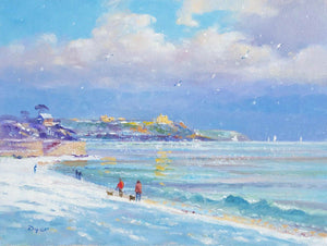 Bright Light on the Snow. Gyllyngvase Beach. Original oil Painting by Artist Ted Dyer