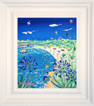 A delightful new painting by artist John Dyer featuring Gyllyngvase Beach in Falmouth. Relaxing blues, aquas combine on the canvas to describe the clear inviting water and the beautiful blue agapanthus flowers. A couple sit on the sea wall looking out to see and bathers, seagulls and sailing boats complete this idyllic scene.