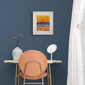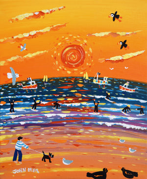 Experience the vibrant energy of the St Ives sunset with 'St Ives Sunset Walkies'. This stunning 10x12 inch acrylic on canvas captures the essence of Cornwall's iconic coastline. The orange glow and vibrant energy-filled art will add energy to any space, from surfing the sunset-coloured waves to spotting puffins. Bring home a piece of Cornwall with this exclusive painting by renowned Cornish artist John Dyer.