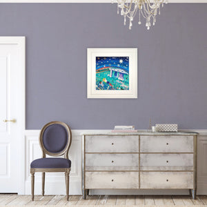 A couple relax on the soft grass that surrounds the quoit and gaze at the magical star spangled sky that illuminates the scene. Gold and silver leaf has been applied to the surface of the painting to make it light up as one moves past it. The painting catches the light, literally twinkling like the stars and the silver leaf is used to illuminate Lanyon Quoit too.