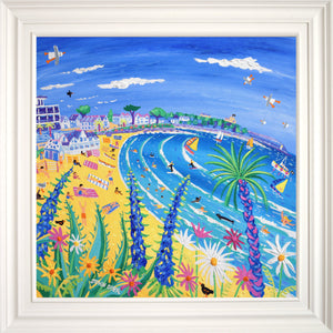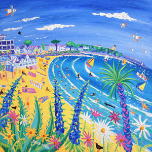 'Tropical Days at Gyllyngvase Beach, Falmouth', 30 x 30 inches acrylic on canvas. Coastal Paintings of Cornwall by Cornish Artist John Dyer