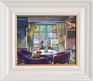Ted Dyer's painting of the interior of the Ferry Boat Inn at Helford Passage is a beautiful example of the artist's work. Rich colours combine in a palette of purples. A dachshund sausage dog gazes out of the window past the vase of flamboyant flowers to the river beyond. There is a real sense of warmth in this painting with the paint being used to create a wonderful sense of light.