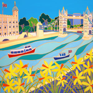 In this beautiful spring coloured original oil painting by Joanne Short, pleasure boars drift lazily down The Thames past the iconic Tower of London, heading towards Tower Bridge. Yellow spring daffodils line the banks of the river under a clear blue sky. A really special painting of London by Cornwall's best-known colourist artist.