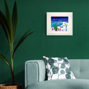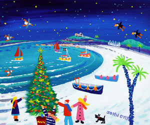 Indulge in a little Christmas spirit with this delightful painting by John Dyer. 'Christmas on the Beach, Tresco' is a beautiful and festive scene, depicting people in colourful hats and scarves singing and dancing around the Christmas tree on the white sanded beach on Tresco. There is a dark, starry night sky, while the twinkling colours of the boats in the bay add a touch of magic to the scene.