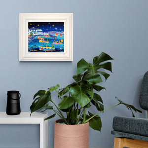 'Customs House Christmas, Falmouth' by John Dyer is a beautiful and festive painting that captures the spirit of Christmas. Small boats with lit-up Christmas trees sail into the harbour as their helmsmen wave and sing on Christmas eve. The pub is lit up as a warm welcome, and the starry night sky creates a magical atmosphere. This painting is sure to bring joy and happiness to any home during the holiday season and is a wonderful example of this acclaimed cornish artist's work.
