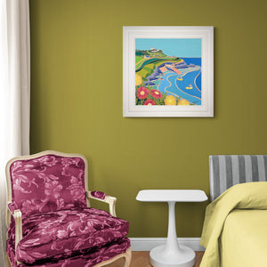 The Hottentot figs flower with yellow and pink blooms on the cliff and the fishing boats in the sea add to the scene. The wonderful space, colour and air of Cornwall's cliff walk make this painting come alive. It would be a perfect addition to any home, bringing a little bit of that Cornwall magic into your life.