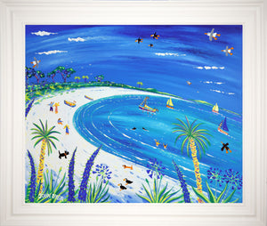 'Puffins at Pentle Bay' by John Dyer is a fantastic and idyllic acrylic painting that captures the joy of a day spent by the sea. A family is playing on the sweeping white beach, while dogs frolic in the sand and puffins waddle by. The couple swimming in the azure waters add a touch of romance to the scene, and the boats bobbing on the sparkling waves complete the picture of perfect seaside tranquillity. This painting is sure to bring a touch of Tresco summer sunshine into any home and would make an excellent addition to any art collection.