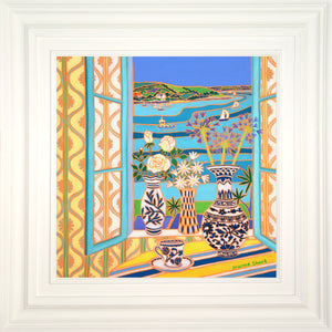 A stunning coastal landscape, this 18x18" oil on canvas by Cornish artist Joanne Short features patterned wallpaper, intricately designed pottery, white roses and blue agapanthus in a vase, and a view through a window to Trefusis Point and the River Fal beyond. With its French Matisse-like vibrancy, this exquisite piece brings a touch of Cornish beauty and the best Cornish coastal art to any home.