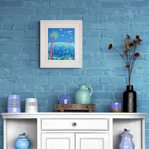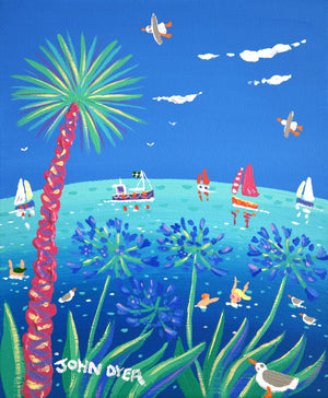 Introducing 'Summer Blue', a charming 10x12 inch acrylic on canvas seascape by the well-loved Cornish artist John Dyer. This vibrant coastal painting captures the joy and energy of a perfect summer's day in Cornwall. Bold, bright colours bring the scene to life, from the striking agapanthus flowers and a swaying palm tree to boats sailing peacefully on the sea. Playful seagulls and swimmers add a delightful touch of fun, making you feel like you're enjoying the day.