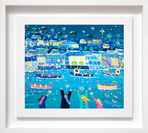 The painting captures the essence of community and celebration as families reach out to catch falling snowflakes, embodying the playful spirit of the season. Polperro’s unique character is lovingly depicted, with its picturesque cottages cascading down the hillside and the bustling harbour filled with life.
