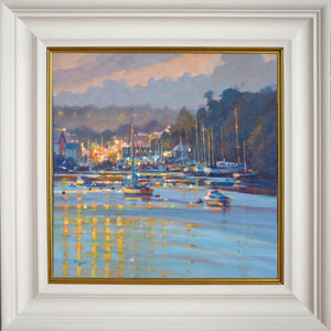 “Reflections at High Tide, Penryn River” is a wonderfully atmospheric 14 x 14-inch oil on canvas by the much-loved Cornish artist Ted Dyer. In this tranquil twilight scene, the gentle glow of the harbour lights shimmers on the water, weaving a soft tapestry of colour and reflection. Ted’s expressive brushwork and carefully chosen palette bring a warm, comforting quality to the piece, capturing that magical hush of evening along the river.