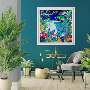 In ‘Banana Harvest and Fireflies, Costa Rica’, Cornish artist John Dyer brings together memories and studies from his Costa Rican expedition to create a vibrant large scale painting that radiates warmth, colour and life. Painted for his Spirit of the Harvest exhibition at the Eden Project, this work celebrates the abundance and biodiversity of the Caribbean rainforest.