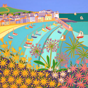 This 24x24 inch oil on canvas from Cornish artist Joanne Short is a beautiful representation of St Ives harbour and its surrounding floral gardens and planters. The vibrant colours used by the artist bring this sunny seaside town to life with blue and turquoise bands of water creating the incoming tide in the harbour. The yellow and pink daisies, blue agapanthus, tropical palms, and sailing boats all add to the celebration of St Ives and life on the coast. This original oil painting by Joanne Short a stunning example of Cornish art at its best.