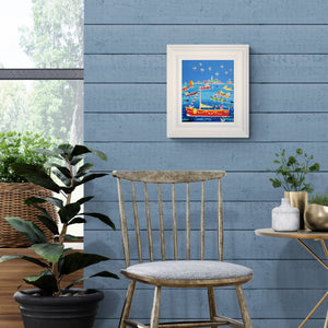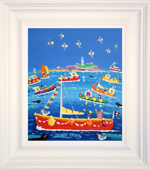 Presenting 'Fishing Trip to Godrevy', a vibrant 10x12 inch acrylic on canvas by renowned Cornish artist John Dyer. This joyful seascape captures the bustling activity of fishing boats around the iconic Godrevy Lighthouse, a beloved landmark in Cornwall. With bright primary colours and dynamic brushstrokes, Dyer brings to life the playful nature of the boats, fishermen, and seals swimming through the blue waters. Seagulls soar overhead, adding a sense of movement and freedom to the scene.