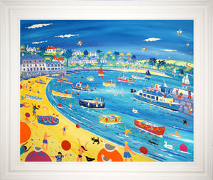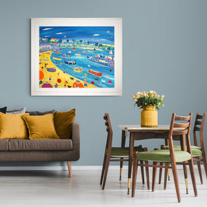 Enjoy the beauty of John Dyer's original painting, 'Summer Days, St Mawes', as it radiates sunshine and life. This painting is a vibrant portrait of Cornwall, featuring St Mawes village, the Fal River ferry, sunbathers, swimmers, St Mawes swans, a seal, seagulls, the bright blue sea and the Idol Rocks Hotel. With the Cornish sunshine that radiates off the painting, it’s sure to bring a touch of summer charm to any room.
