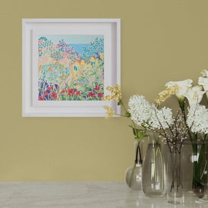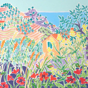 Joanne is a master of capturing the patterns and shapes of the landscape and in this painting the distant hills are described with simple but effective brush strokes and careful colour choices to bring the full majesty of the Italian countryside to life. Poppies and wild grasses feature with Olive trees and a view to Dolceacqua in Liguria, Italy.