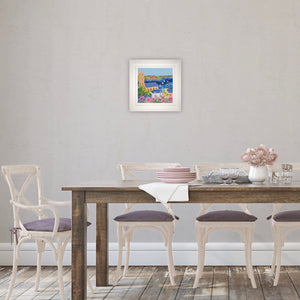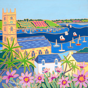 In this beautiful oil painting of Joanne’s home town of Falmouth, Gazanias and palm trees fill the foreground in the view from the town, across the bay to Trefusis Point. The church sits proudly overlooking the water as boats sail by. This painting will brighten the room and make you smile.
