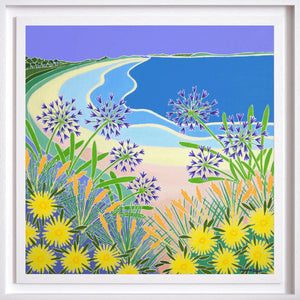 In this large-scale original painting, Joanne Short invites us to experience Pentle Bay on Tresco through a vibrant veil of summer flowers. A symphony of golden yellow hottentot figs, beach marram grasses, and iconic blue agapanthus leads the eye towards the sweeping arc of pale sand and azure sea beyond.
