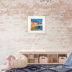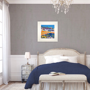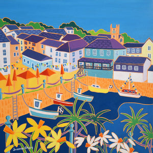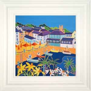 The sumptuous colours Joanne has used in this oil painting of Customs House Quay in Falmouth depict the summertime glow of an early morning. The bright sun umbrellas and colourful bunting create that feeling of summer fun under a clear blue sky. This painting will bring a room alive with happy memories of sunshine holidays.