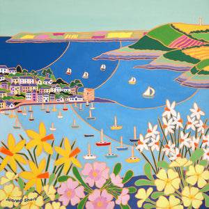 In this stunning oil painting of the view across the River Fowey to Polruan and out to sea, Joanne captures the feeling of a perfect spring day as we peep through the daffodils and primroses. Several boats sail into the mouth of the river while others are moored near the town. The sumptuous colours of the flowers in the foreground are echoed in the patterned fields on the headlands creating a sense of harmony. The atmosphere in the painting is one of calm and tranquility; the perfect Cornish holiday feeling.