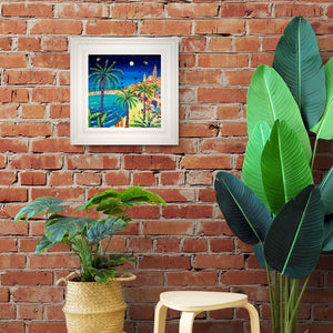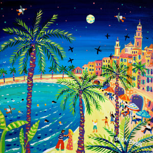 Discover the enchanting charm of the French Riviera at night with this beautiful new painting by British artist John Dyer. 'Love under the Moon, Menton, France' captures the magic of an evening stroll through the old town of Menton, illuminated by a full moon. Tall palm trees and banana plants give the scene a tropical feel, while swifts dart through the air in the summer heat. The perfect way to bring a little bit of la dolce vita into your home, this stunning painting is sure to fill you with a sense of joie de vivre.