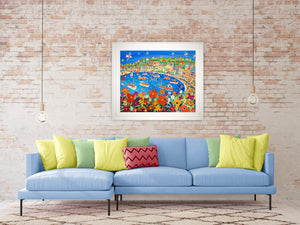 This major John Dyer painting captures the vibrancy and colour of life in Mousehole harbour in Cornwall in the artist's unique way. Wonderful, huge and colourful flowers fill the foreground with the artist's brush strokes capture energy and texture. Seagulls swoop across the Cornish blue sky and fishing boats and swimmers float in the harbour. Brilliant fun and full of energy and optimism.