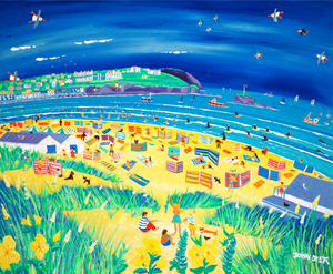 Sunbathers, windbreaks and saucy seaside fun on the beach are all captured in this spectacular new painting by Cornish artist John Dyer. The painting depicts all the colour and fun of high summer on Perranporth beach in Cornwall. The painting has it all, golden hot sand, crashing waves, surfers, fishing boats, seagulls, dogs, seals and even a puffin flying through the blue sky. Wild flowers and grasses grow in the dunes and a family gets ready for a swim in the sea. The Watering Hole cafe can be seen on the left of the painting and the town of Perranporth on the headland beyond. Stunning.