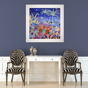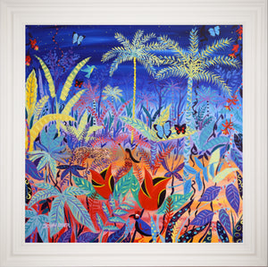 John painted this working alongside an Amazon Indian & his work featuring the Amazon spirits is a world first. The Jaguar depicts the huge power of Vana who is the spirit that the tribe experience when reborn as a Shaman. Tropical plants, birds & butterflies feature throughout the painting. Featured in the new book about John Dyer & retrospective exhibition.