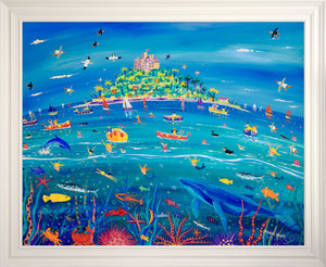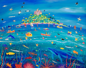 "Underwater Wonders, Mount's Bay" is a 48x60 inch acrylic painting by Cornish artist John Dyer, capturing different sea life and human activity in Mount's Bay in Cornwall. Featuring a humpback whale, mackerel, lobsters, crabs, starfish, mermaids, dolphins, puffins, gannets, seagulls, fishermen and the sub-tropical island of St Michael's Mount, this exquisitely detailed painting captures the unique beauty of Cornwall's seascape. It is one of the artist's most accomplished paintings to date. A rare large canvas from Cornwall's best-loved artist and a real celebration of Cornish life and biodiversity.