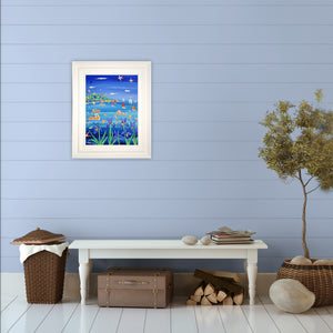 Castle Beach in Falmouth is a favourite subject for artist John Dyer to explore with his paints. In this new painting the artist has created a vibrant scene of Cornish mermaids, fishing boats and fun with a gorgeous foreground of blue iris flowers. Pendennis castle can be seen in the background on the headland proudly flying the Cornish flag. Seals and swimmers complete this wonderful piece.