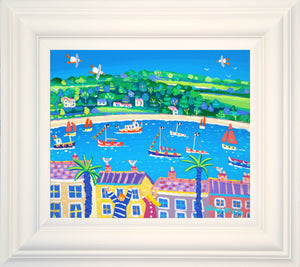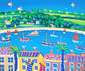 This delightful John Dyer painting of Falmouth in Cornwall, features the view across the river towards Trefusis Point. Two people wave their arms excitedly in the foreground of the painting, celebrating the sunshine and colour of Cornwall. The palm trees take our view out across the houses to the colourful boats in the sparkling sea beyond. Perfect.