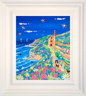 Sea Pinks and Cornish wild flowers, on the cliffs at Chapel Porth, combine to create a delightful painting of a walk along the clifftop. A dog watches the seagulls swooping above and seals enjoy the crashing waves as they hit the shore. The tin mine stands proudly in the landscape, part of Cornwall's proud mining past. A wonderful new John Dyer painting that captures so much of the Cornish spirit.