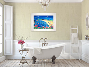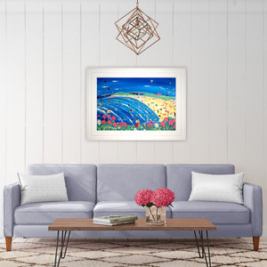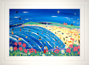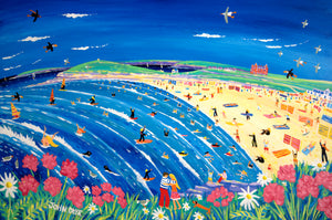 This stunning new painting of Fistral Beach in Newquay, Cornwall by artist John Dyer has it all. John Dyer's famous seagulls, puffins, surfers, swimmer and seals all add fantastic narrative to this colourful painting. Sea Pinks grow on the cliffs in the foreground and a couple embrace as they enjoy their holiday in Cornwall as their sausage dog looks on. A window into Cornwall for your home.