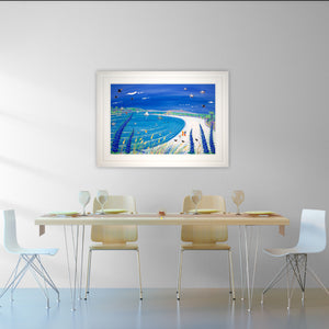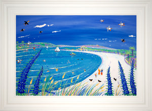 This stunning painting by artist John Dyer explores the wonderful landscape and colours of Pentle Bay on the island of Tresco. Our view is through towering blue echium flowers and wild grasses growing in the sand dunes. A family can be seen on the white beach and swimmers and seals enjoy the brilliant blue sea. Sailing boats, puffins and seagulls complete this perfect painting.