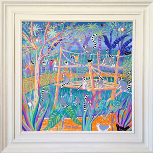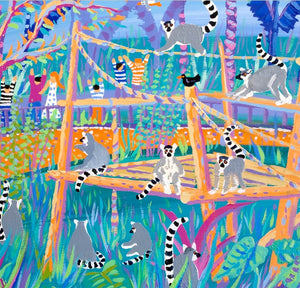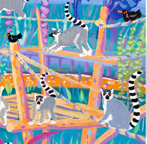 A very special painting of Ring Tailed Lemurs painted during John Dyer's residency for the Darwin 200 UK celebrations. Appointed as the official artist for the UK celebration this painting was painted in the lemur enclosure at Newquay Zoo in Cornwall. The lemurs climbed all over the artist's easel while he was in the enclosure. Tropical plants with bright oranges & lime greens create a jungle feel.