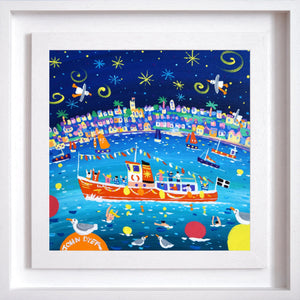 A burst of summer colour fills ‘Falmouth Harbour Fun’, where John Dyer brings one of Cornwall’s best-loved harbours to life with joy, movement and coastal charm. The brightly painted houses of Falmouth curve around the shoreline, their facades  glowing beneath a deep blue night sky dotted with swirling stars. The scene feels celebratory, full of the warmth and character that makes Falmouth such an inspiring place for the artist to live and work in.
