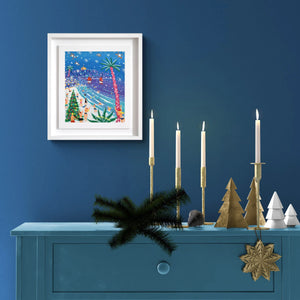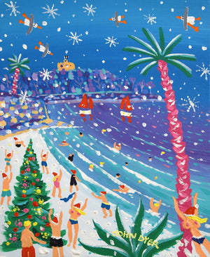 Snow drifts across a vivid blue sky, creating a wonderfully surreal mix of winter and tropical colour. Palm trees stand tall on the sand and a fully decorated Christmas tree adds a festive centrepiece to the beach. In the background, the headland at Gylly glows softly while seabirds sweep overhead, echoing the movement of the waves.