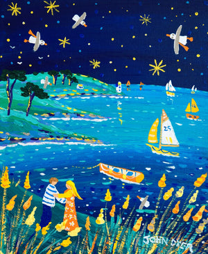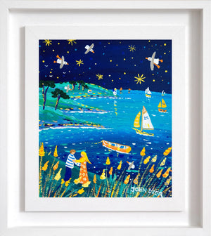 Evening gathers gently over the Roseland Peninsula in ‘Roseland Lovers’, where John Dyer paints a coastline alive with colour, movement and the quiet rhythm of summer. Starlight scatters across a deep blue sky while seabirds circle above the glowing water, their wings catching the last hints of daylight. Small sailboats drift across the bay, adding to the peaceful sense of open space.