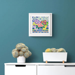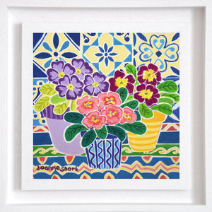 This radiant still life by Cornish artist Joanne Short celebrates the joy of spring through colour, pattern and beautifully composed design. In ‘Spring Flowers on a Patterned Tablecloth’, three pots of primroses sit harmoniously together, each one painted with Joanne’s distinctive clarity of line, decorative rhythm and glowing palette.