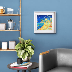 The scene unfolds in vivid colour: turquoise sea, soft sand, and sunlit villas framed by palm trees and exotic plants. Figures relax beneath striped parasols while swimmers drift through clear water, creating a composition alive with movement and Mediterranean light. Dyer’s expressive brushwork and luminous palette of cobalt, coral, lemon and jade capture both the tranquillity and vitality of the Riviera at its finest.