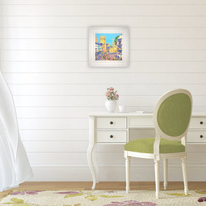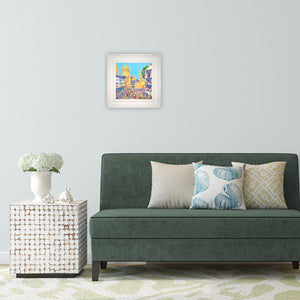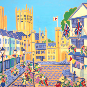 The Market Square in Wells, Somerset is a very special place which is captured perfectly in this delightful original oil painting on canvas by Somerset artist Joanne Short. The flags fly proudly as the bunting strung around the square sways in the breeze and the magnificent Wells Cathedral towers above the pretty buildings in this quintessential English city. This painting will brighten up your wall with its multicoloured flowers and coloured buildings. A perfect painting of Somerset.