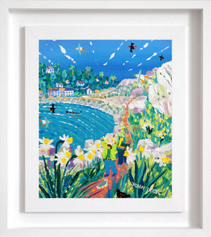 Painted with John Dyer’s distinctive use of colour and expressive brushwork, the scene radiates warmth, energy and optimism. The painting captures that familiar Cornish moment when spring truly arrives, when the coastal paths glow with flowers, birds fill the air and the sea sparkles under clear skies.
