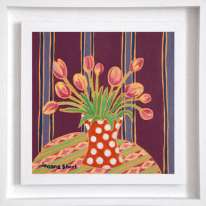 The composition centres around a charming red polka-dot jug, brimming with soft pink tulips whose curving stems and closed buds stretch elegantly across the canvas. Set against a richly patterned background of burgundy and slate-grey verticals, and placed on a diagonally striped tablecloth in vibrant citrus hues, the painting draws the eye into a harmonious play of colour and pattern.