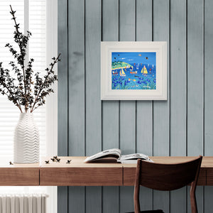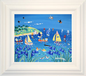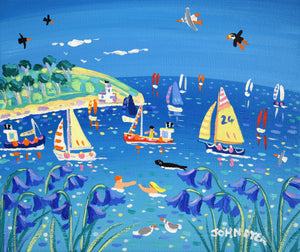 Experience the beauty of Cornwall with 'Bluebell Days, St Anthony Lighthouse' by Cornish Artist John Dyer. This 10x12 inch acrylic on canvas captures the essence of the coast with its vivid blue sea, stunning cliffs adorned with wild bluebells, and a charming view of St Anthony Lighthouse. The playful addition of a seal, bathers, and sailing boats adds to the overall sense of light and fun.