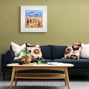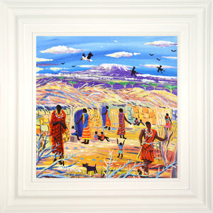 Experience the unique African culture with this 18x18 inches acrylic painting by renowned British artist John Dyer. Featuring Maasai warriors, a traditional boma, and vibrant African colour, this piece showcases the daily life of Kenya's culture as John was given exclusive access to paint it.