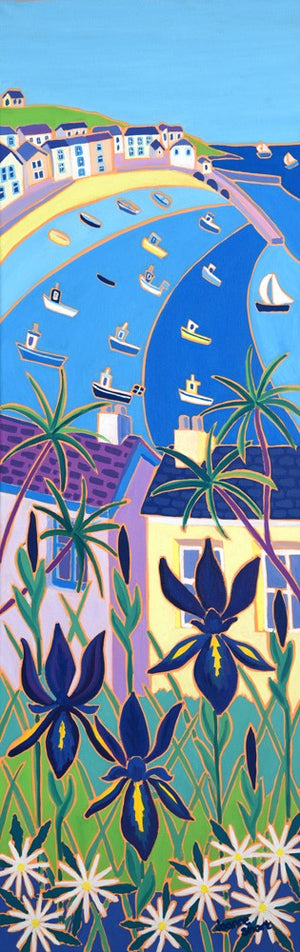 A striking original oil painting of St Ives in Cornwall by Newlyn Society artist Joanne Short. Blue iris & elegant palm trees lead our eye to the cottages and rooftops and then the huge sweep of the harbour has been captured with bold bands of blue. The town of St Ives curves around to hold the sea. Many fishing boats gather on the calm blue sea. This is a stunning colourist post-modern painting.