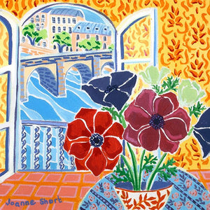 A French still life oil painting of anemones in a Paris window looking towards the river Seine by British artist Joanne short. The painting has a great sense of pattern with the wall paper and table-cloth echoing the work of Matisse. The window is wide open so we can see the bridge with the water swirling through the arches. Parisian buildings line the river. A really stunning oil painting.