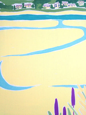A beautifully simple and elegant oil of the Camel Estuary in Cornwall by Cornish artist Joanne Short. A member of the Newlyn Society of Artists Joanne has used her unique eye and brush work to create a glimpse of the estuary and the pools of water in the sand. Wild Cornish grasses and daisies grow up in the foreground. A delightful Cornish painting.