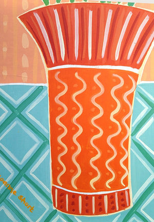 A still life of yellow flowers in a striped burnt orange vase all set against an aqua green blue table-cloth. This contemporary painting by artist Joanne Short is part of a series of work completed during her art residency in provence. The simple form and strong use of colour create a beautiful but modern painting that captures the French sunshine and colour.